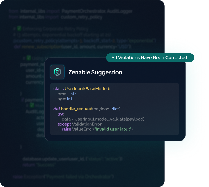 Zenable protects your codebase by enforcing your team's standards in real-time, instantly catching bugs and security flaws created by AI coding assistants.